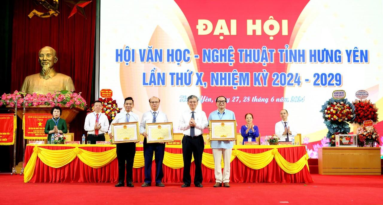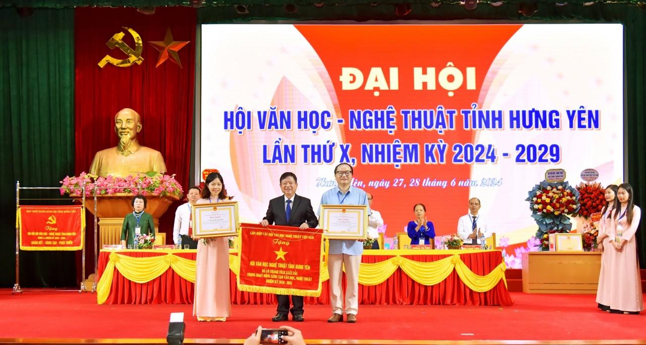 Nhân dịp này, nhạc sĩ Đỗ Hồng Quân, Chủ tịch Liên hiệp các Hội Văn học - nghệ thuật Việt Nam tặng Cờ thi đua của Liên hiệp các Hội Văn học - Nghệ thuật Việt Nam cho Hội Văn học - Nghệ thuật tỉnh; đồng chí Trần Quốc Toản, Phó Bí thư Thường trực Tỉnh ủy, Chủ tịch HĐND tỉnh đã tặng Đại hội Hội Văn học - Nghệ thuật tỉnh Hưng Yên khóa X, nhiệm kỳ 2024 - 2029 bức trướng của Ban Chấp hành Đảng bộ tỉnh với nội dung “Đoàn kết - Sáng tạo - Phát triển”; đồng chí Nguyễn Duy Hưng, Phó Chủ tịch UBND tỉnh tặng Bằng khen của Chủ tịch UBND tỉnh cho 3 tập thể có thành tích xuất sắc trong hoạt động văn học, nghệ thuật nhiệm kỳ 2018 – 2024. Cá nhân đồng chí Chu Huy Phương, Chủ tịch Hội Văn học - Nghệ thuật tỉnh và đồng chí Hoàng Thị Thanh Mai, nguyên Phó Chủ tịch Hội Văn học - Nghệ thuật tỉnh cũng được tặng Bằng khen của Liên hiệp các Hội văn học nghệ thuật Việt Nam vì những đóng góp cho hoạt động văn học, nghệ thuật nhiệm kỳ 2018-2024.